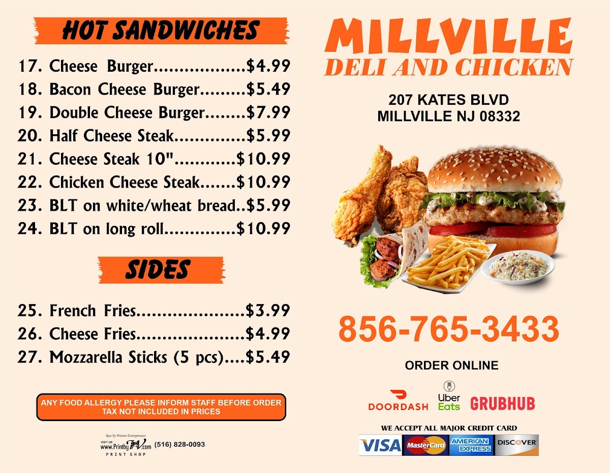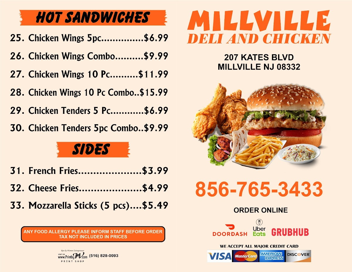 In all, the Millville Deli & Chicken Menu has something for everyone. Whether you’re stopping by for a quick breakfast or sitting down for a more substantial lunch or dinner, there’s no shortage of tasty choices. The menu keeps it simple yet satisfying, focusing on quality ingredients and familiar comfort food done just right. Whether you’re craving a hot, cheesy sandwich, a stack of crispy chicken wings, or a classic sub, you’re sure to leave satisfied.
